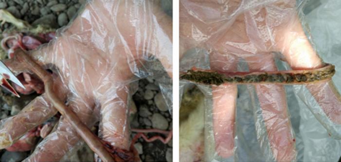 典型的小鵝瘟“臘腸樣”栓塞病變
